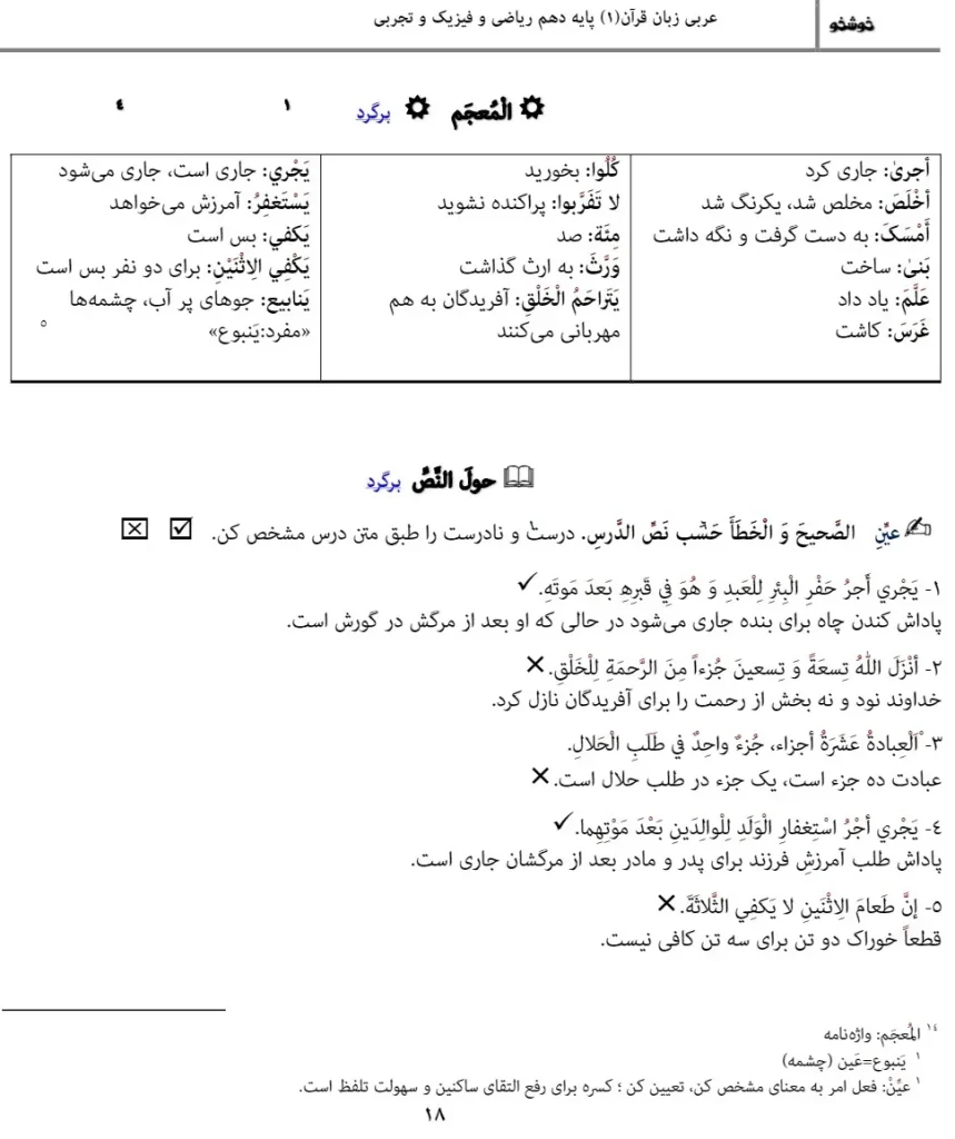 - جواب صحیح و غلط صفحه ۱۸ عربی دهم تجربی