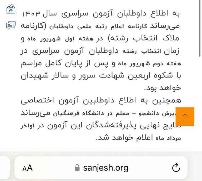 به اطلاع داوطلبان آزمون سراسری سال 1403 ميرساند کارنامه اعلام رتبه علمی داوطلبان (کارنامه ملاک انتخاب رشته) در هفته اول شهريور ماه و زمان انتخاب رشته داوطلبان آزمون سراسری در هفته دوم شهريور ماه و پس از پایان کامل مراسم با شکوه اربعین شهادت سرور و سالار شهیدان خواهد بود.