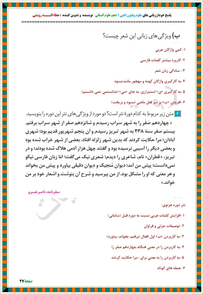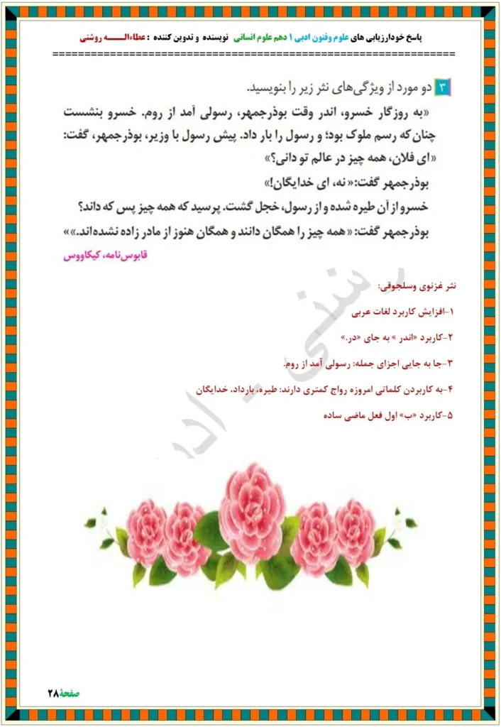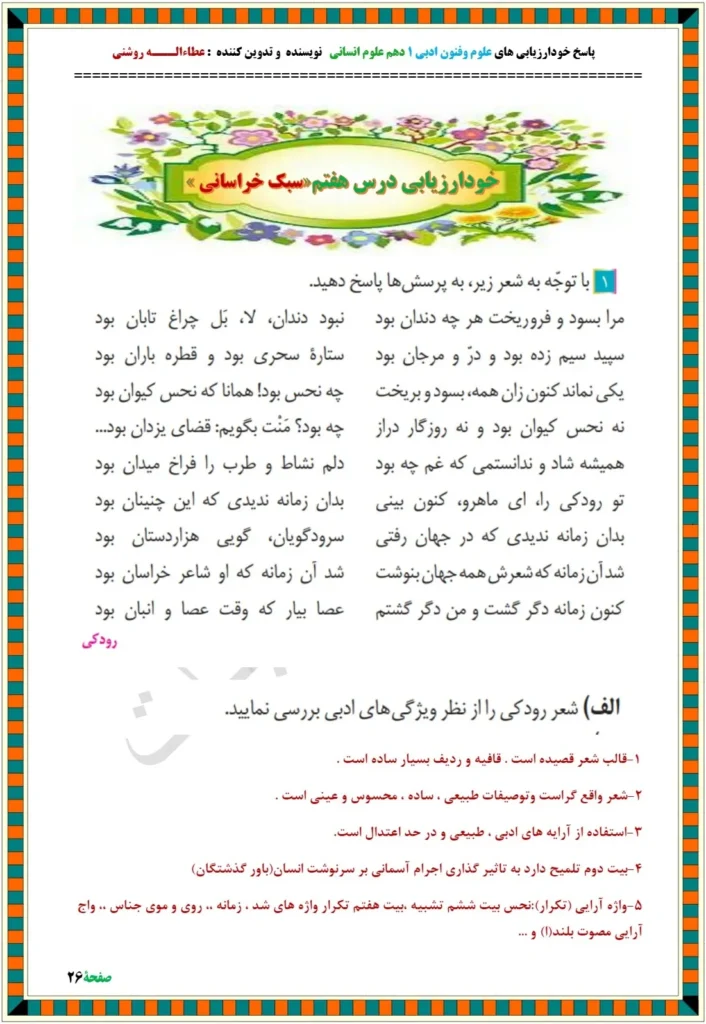 پاسخ خودارزیابی صفحه ۶۵ و ۶۶ درس ۷ فنون دهم